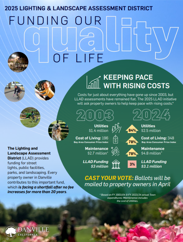 The LLAD is a special district that provides dedicated funding for streetlights, public facilities, parks, and landscaping in Danville. The Town has had an LLAD since 1983, ensuring the continued maintenance of these public spaces. Every Danville property owner contributes to this fund, which has not seen an increase in over 20 years.